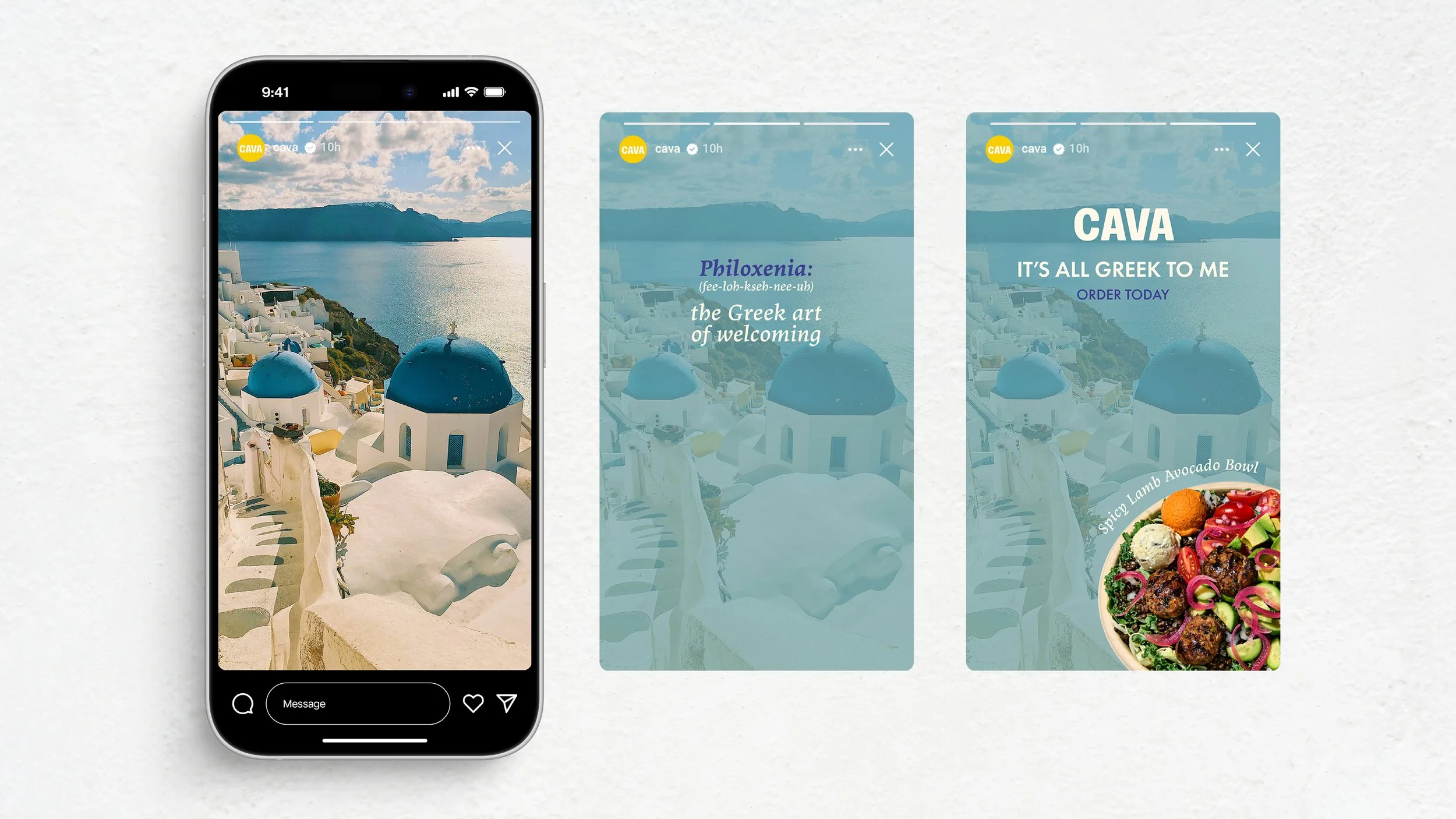 Instagram Story Ads: These dynamic short ads adopt the same Santorini-inspired aesthetic, utilizing the limited color palette and warm textures to maintain visual consistency while promoting specific Cava items and driving traffic with a Call to Action.