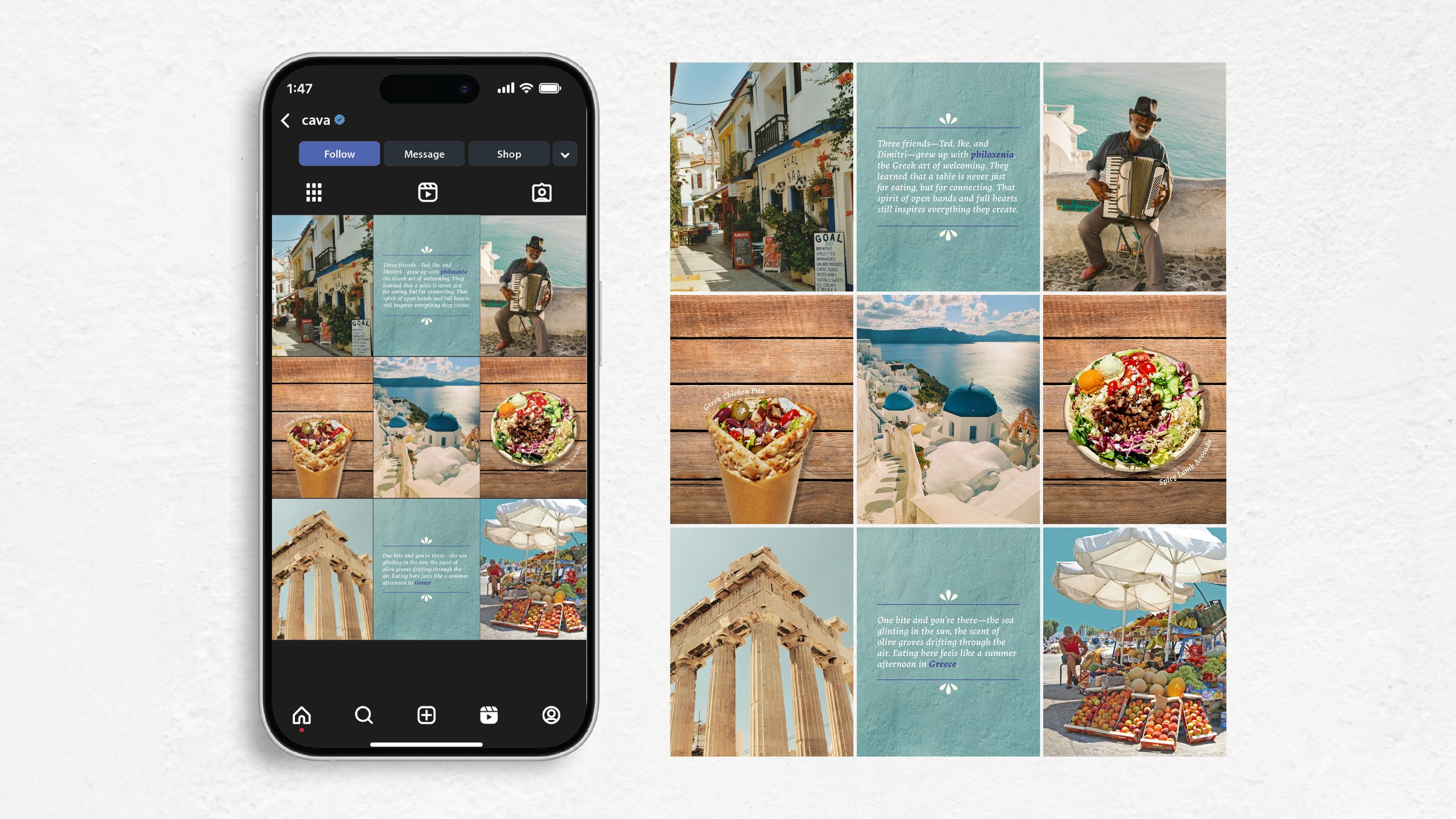Instagram Grid: This feed balances aspirational lifestyle and cultural images of Greece with high-quality, appealing shots of Cava’s food offerings. Key posts feature quotes and facts about Philoxenia, educating the audience on the profound meaning of Greek hospitality and tying Cava directly to this value.